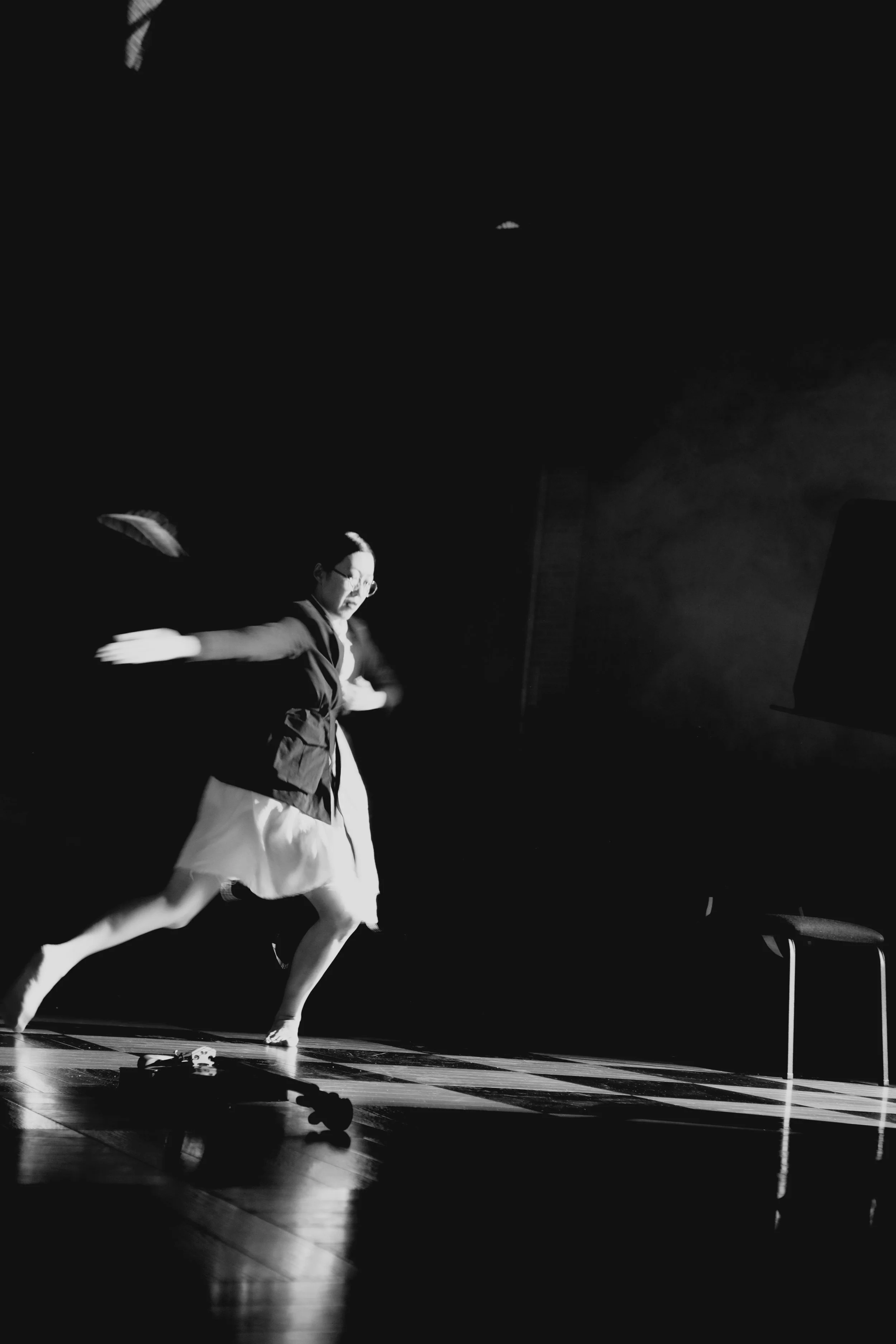 In Luthier Re-embodied, a short dance film installation that’s part of Déjà vu Sonata, I try to re-embody the spirit of precision, perfection, and detail-orientation that describes my great grandfather Fucheng Seetoo (1888-1954; a naval architect, Chinese and Western music lover, and violin maker in Shanghai) in this short dance film. The overhead shot seeks to approximate the viewpoint of an architect facing his blueprint, or a luthier crafting over his work table. The dancing re-interprets the process of violin-making: planning, sculpting, sanding, paint-brushing etc., as well as the curved shape of the violin; it also creates association with mathematics, geometry, measuring, drawing etc. My look makes reference to his look in the photograph taken when he was a young man: slicked hair, old-fashioned glasses, and a dark suit.